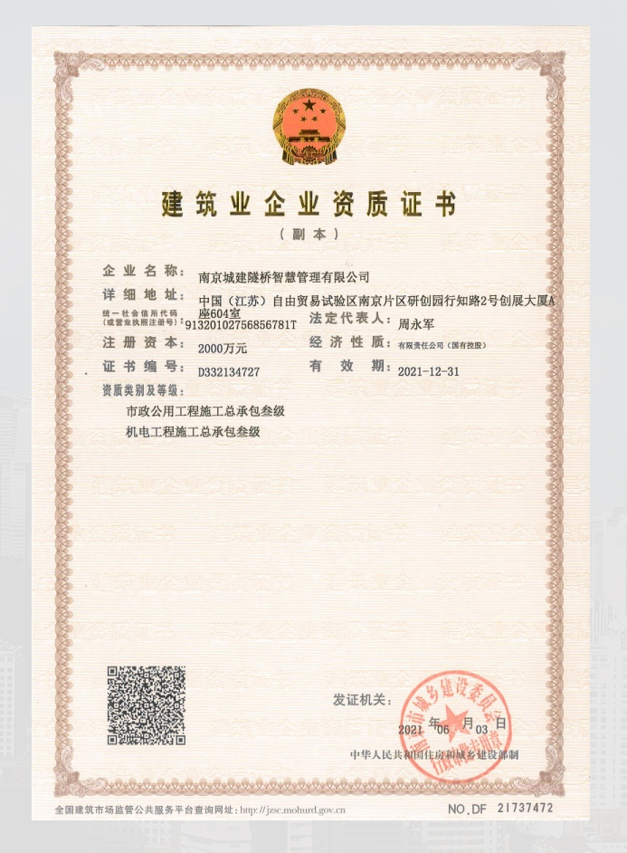 公司历经十几年的发展,现已拥有智能化施工、隧道、市政、机电、防水防腐等多项资质,通过了ISO质量、安全、环境体系认证;是江苏省首批政府授权的项目代建单位。由公司承接的多项建设管理项目荣获国家优质工程奖、全国市政金杯奖、鲁班奖、扬子杯等全国、省、市相关奖项;多次被评为市政工程优秀企业;所管理的市政设施被多次评为全国市政养护示范设施。公司不断探索前沿科技,积极推动向科技型高新企业发展转型,形成了一批拥有自主知识产权的专利成果。 未来,公司将积极对接产业前沿科技,用科技创新引领产业转型发展,积极开拓市场,迈好核心能力构建的坚实步伐,为公众提供更安全、更智慧、更高效的城市设施服务,努力打造成为城市设施智慧化管理的示范企业!